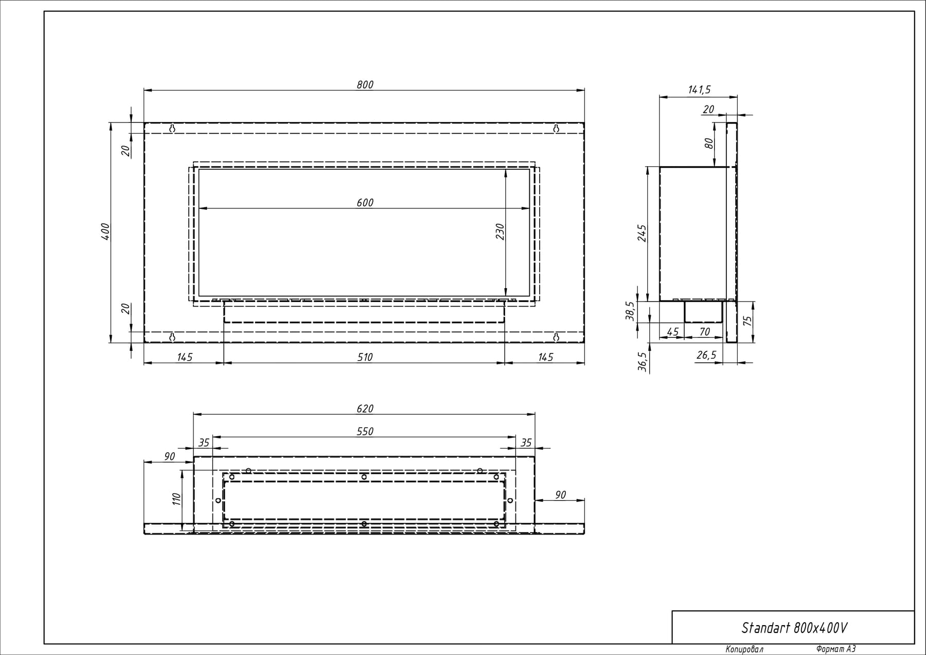Встраиваемый биокамин «Модерн 800V» изготовлен из стали и нержавеющей стали, окрашен термостойкой порошковой краской.