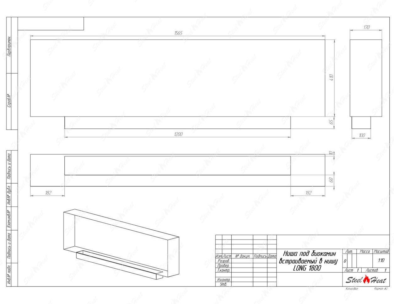 Встраиваемый Биокамин SteelHeat LONG-V 1800 предназначен для встраивания в глухие ниши из гипсокартона, кирпича, пеноблоков, бетона.