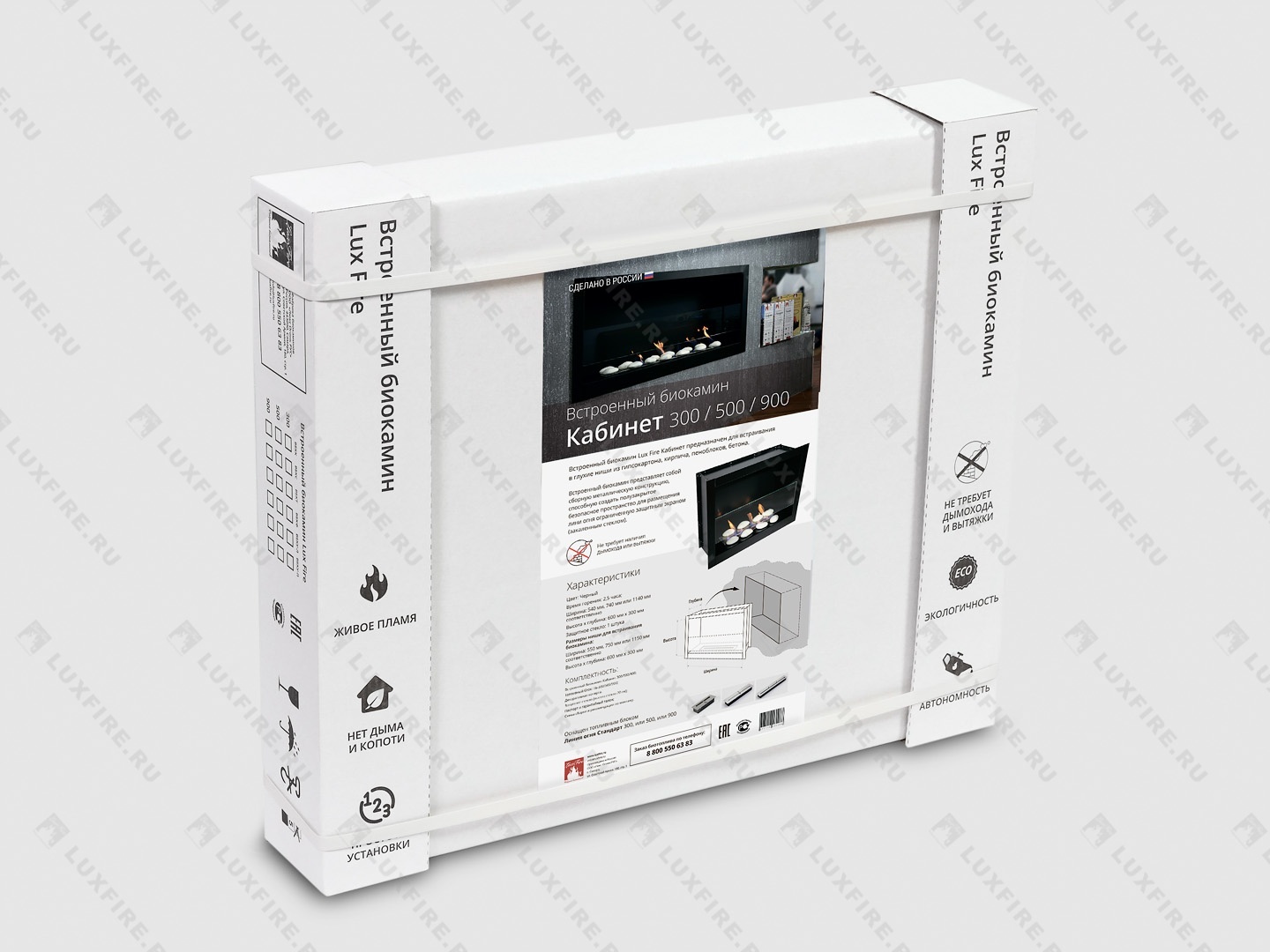 Представляет собой сборную металлическую конструкцию класса М, способную создать полуоткрытое безопасное пространство для огня c топливным блоком Lux Fire 500 М ограниченную закаленным стеклом с трех сторон в больших помещениях от 24 м2